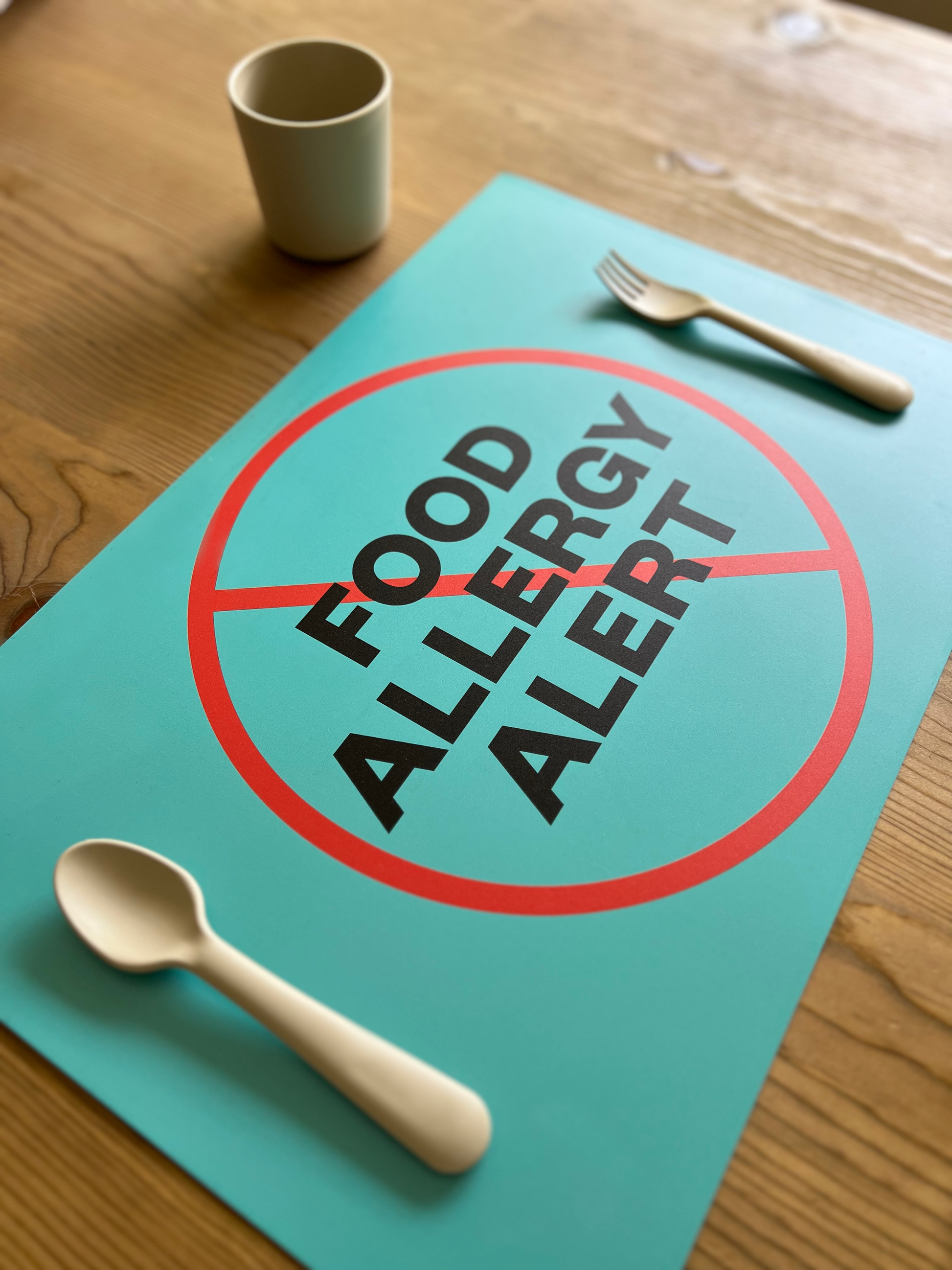 A great way to define your little ones’ allergy-free space when eating or making art, and remind everyone to keep them safe.